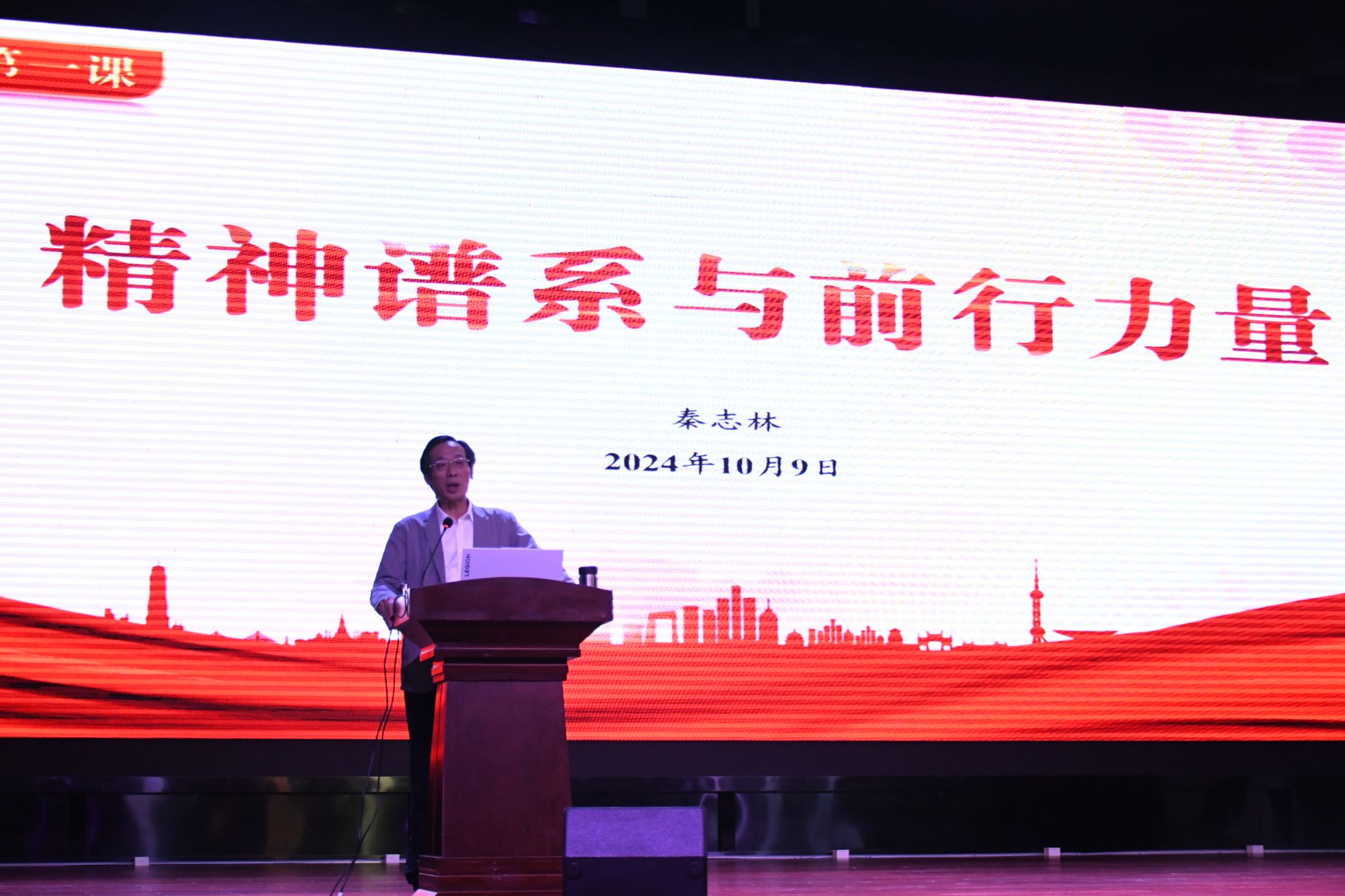 为深入学习习近平总书记关于党的伟大精神的重要论述,大力弘扬以伟大建党精神为源头的中国共产党人精神谱系,从伟大精神中汲取智慧力量,弘扬光荣传统、赓续红色血脉,10月9日晚上,学校党委书记秦志林以《精神谱系与前行力量》为题,为海门校区2024级新生讲授“开学第一课”。海门校区管理办公室、学生工作部等部门负责人以及智能制造学院、建筑工程学院、航空与交通工程学院2024级新生代表共同参加学习。第一课由党委委员、宣传部部长王希颖主持。