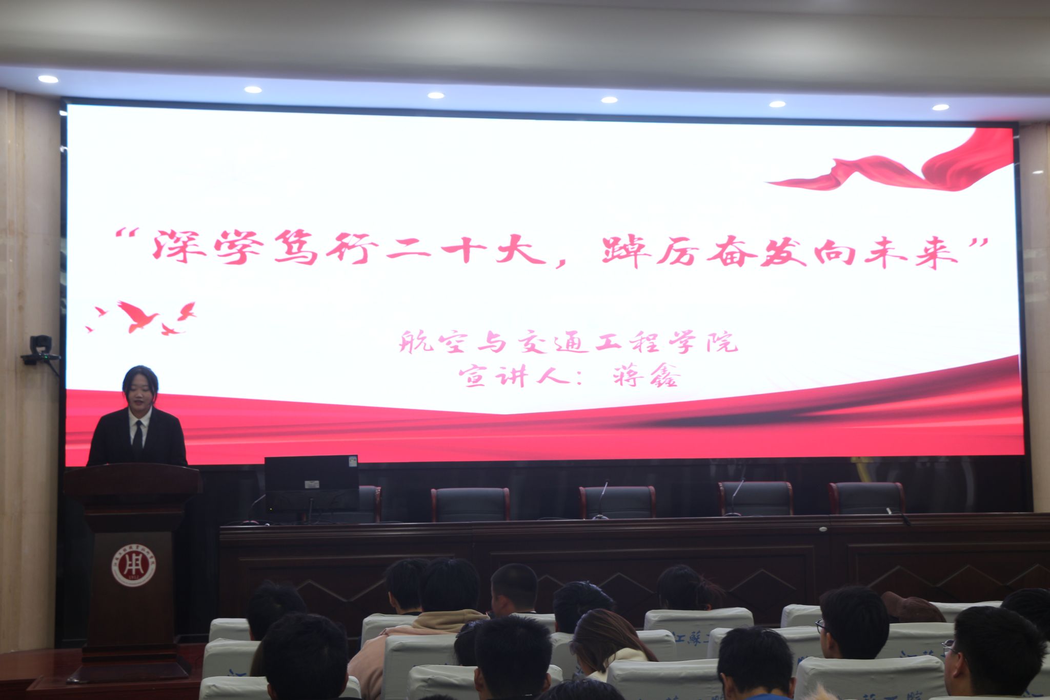 信仰之光,青春梦想。12月18日,航空与交通工程学院“大赛归来话成果”信仰公开课在海门校区200人报告厅开讲。学院邀请今年上半年在挑战杯、互联网+大赛中获奖的4位同学分享他们的大赛经历和青春奋斗故事,学院各班级团员青年代表、青马班成员100余人共同参加了活动,活动由学院团总支书记朱晓茜主持。