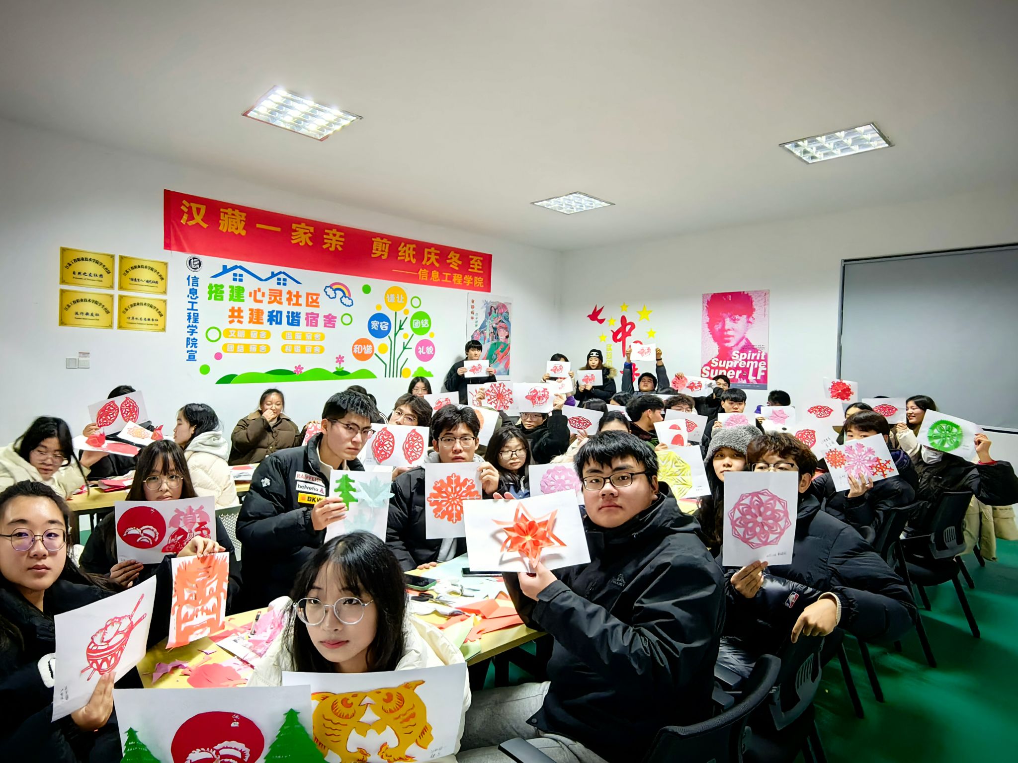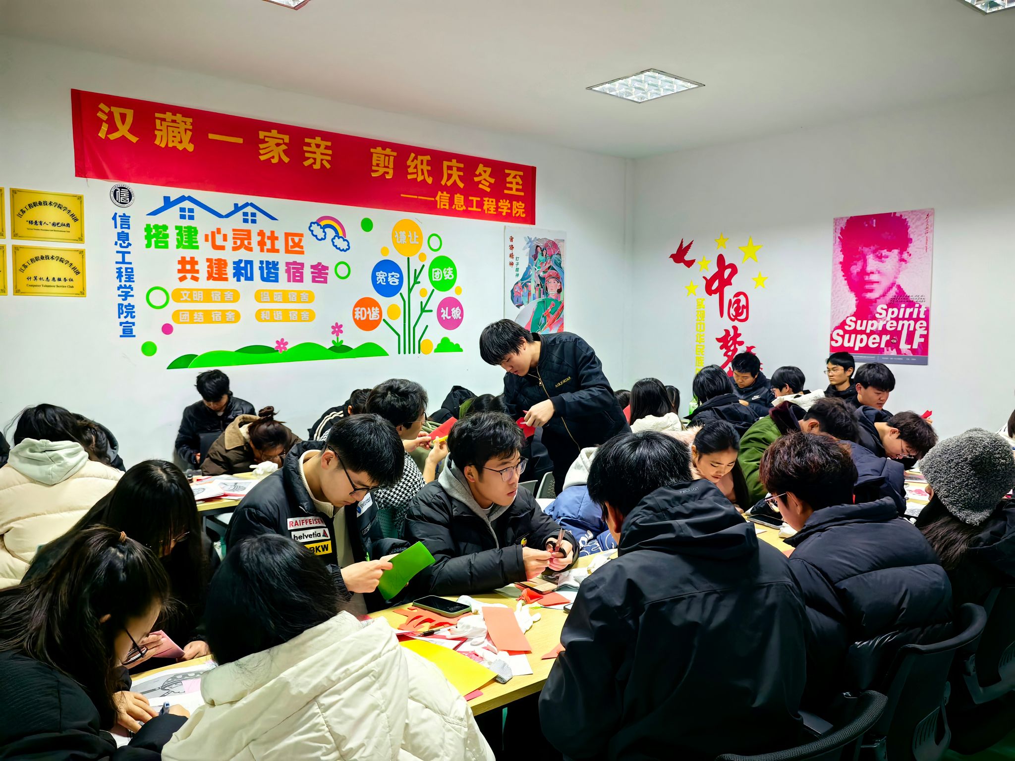 为深化“一站式”学生社区建设,挖掘中华传统节日文化内涵,展示传统“剪纸”文化魅力, 2023年12月22日下午,信息工程学院在海门阜生社区1-2号楼“红色家园”活动室开展“汉藏一家亲,剪纸庆冬至”主题活动。本次活动由“绿意育人”园艺社团和红石榴辅导员工作室联合举办,社团指导老师韩政,部分社团成员和民族生参加。