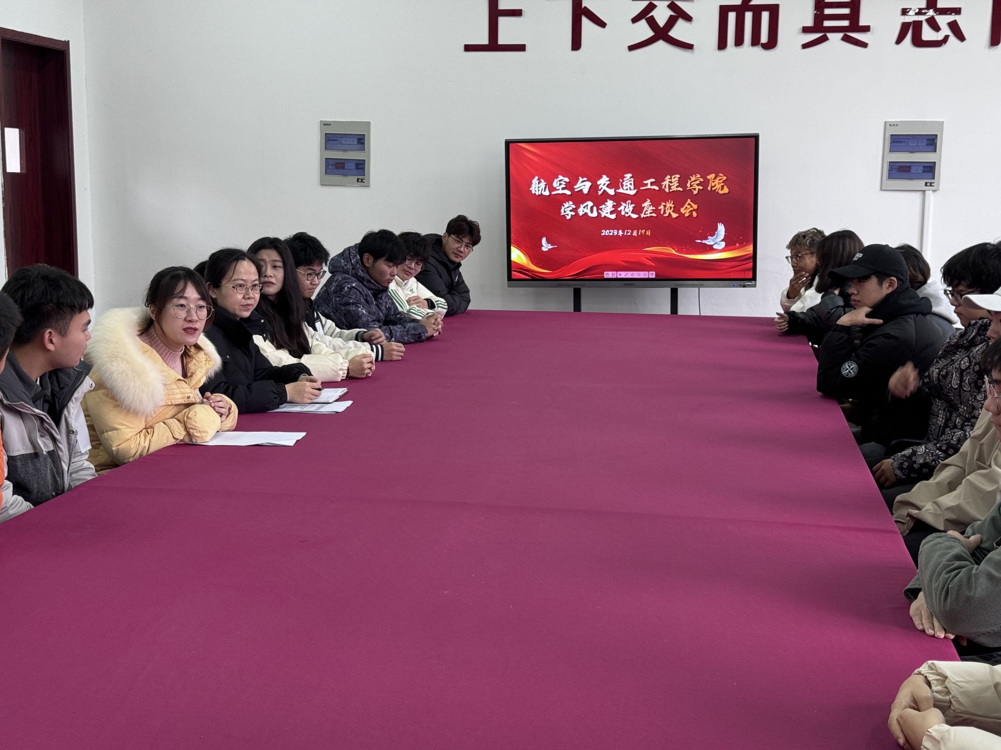 12月19日,航空与交通工程学院在海门实训基地六号楼召开了学风建设座谈会。航空与交通工程学院辅导员老师陶茜茜、谢晓凡及22、23级学生代表参加了本次座谈会。座谈会由陶茜茜主持。